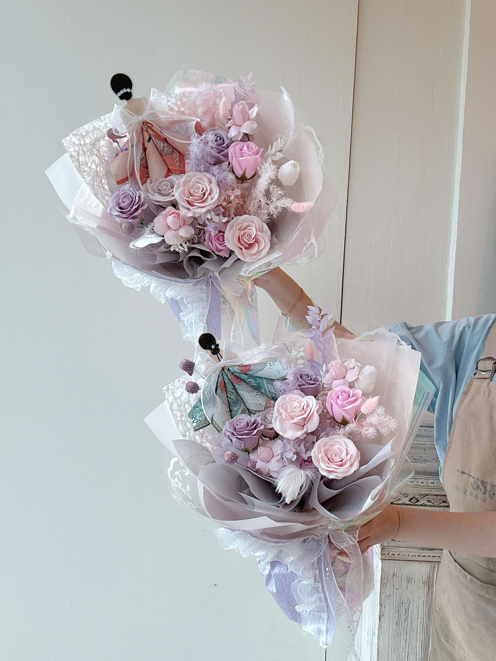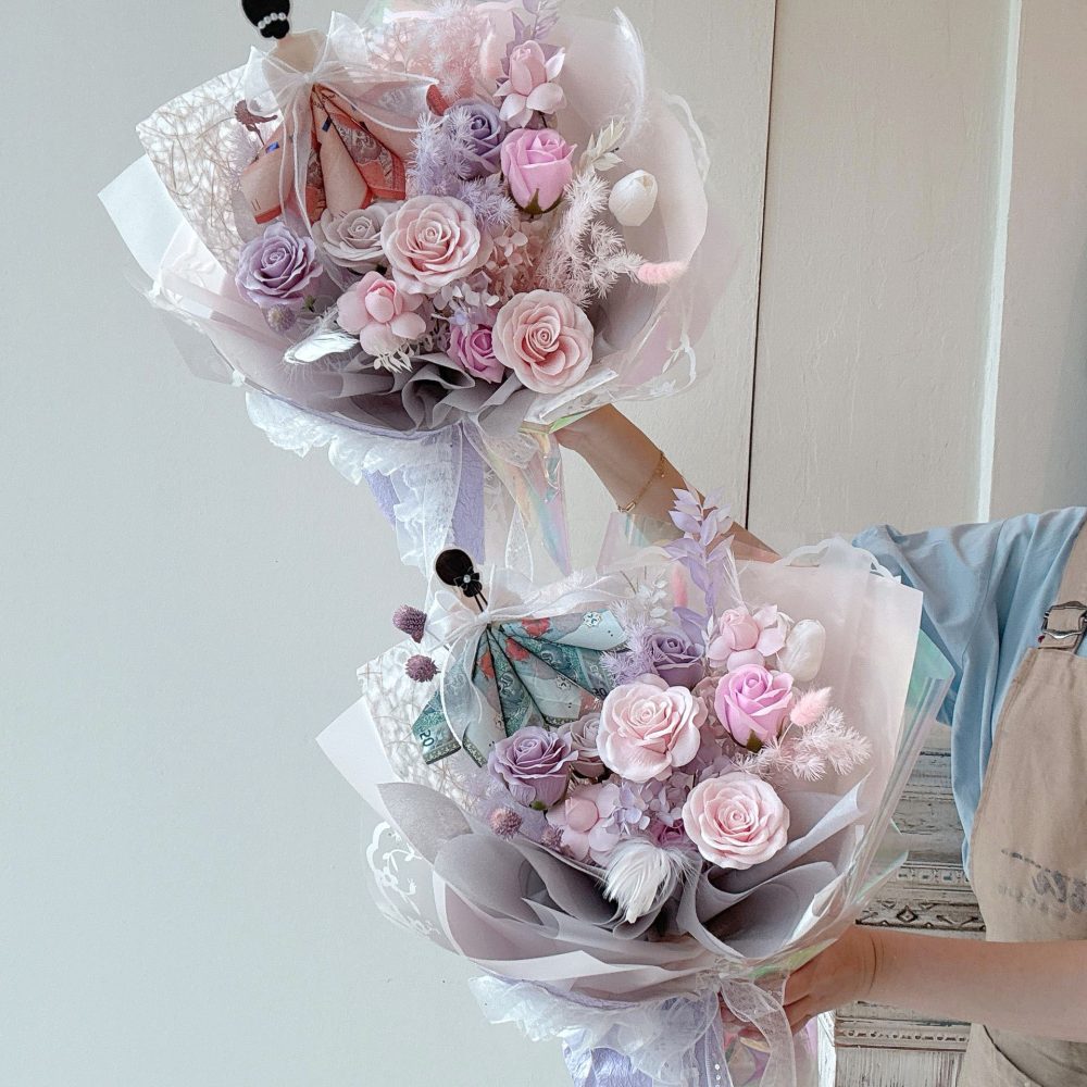 Bloom & Bless – A beautifully arranged bouquet featuring a Soap Flower paired with a Preserved Flower, complete with a cash-gift insert for a thoughtful and elegant presentation.