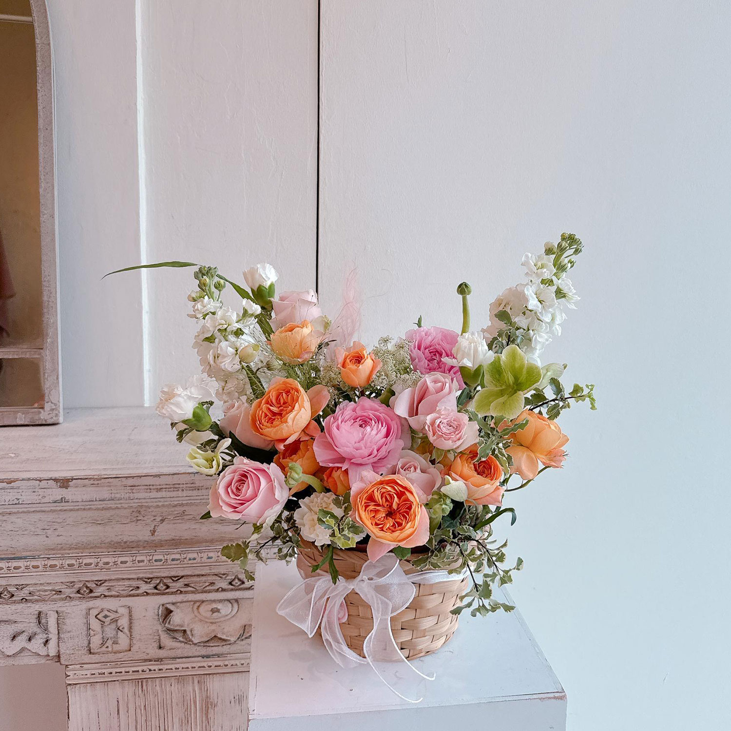 Bloom Basket 06 – a rustic-charm arrangement featuring ranunculus rose spray, classic roses, airy fountain grass, fragrant matthiola, delicate lace flower, and abundant greenery.