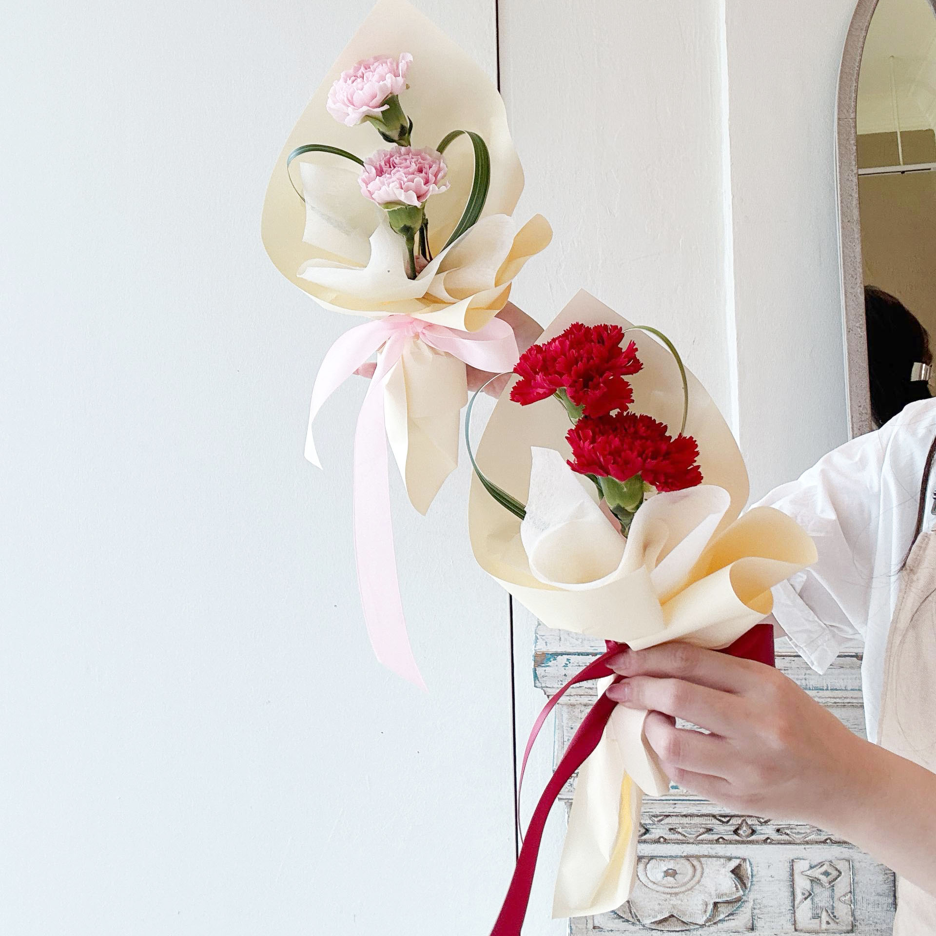 Carnation Duo – A minimal, charming pairing of two soft carnations accented with sleek bear grass for a fresh, elegant touch.
