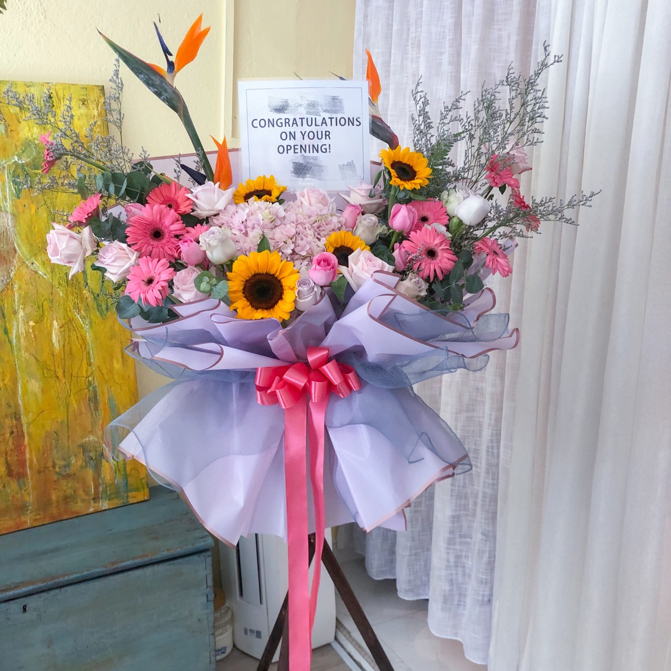 A beautiful Congratulations Stand 15 presenting bird of paradise, Sunflower, daisy, roses, caspia,hydrangea and cineria on flower stand.