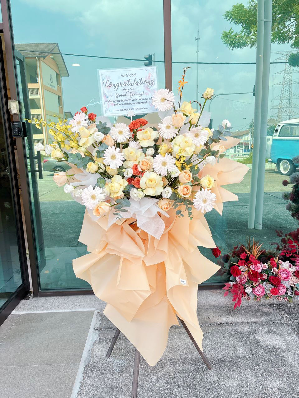 Congratulations Stand 37 – A stylish congratulatory stand featuring daisy, rose spray, yellow dancing lady, buttercup rose & cineria.