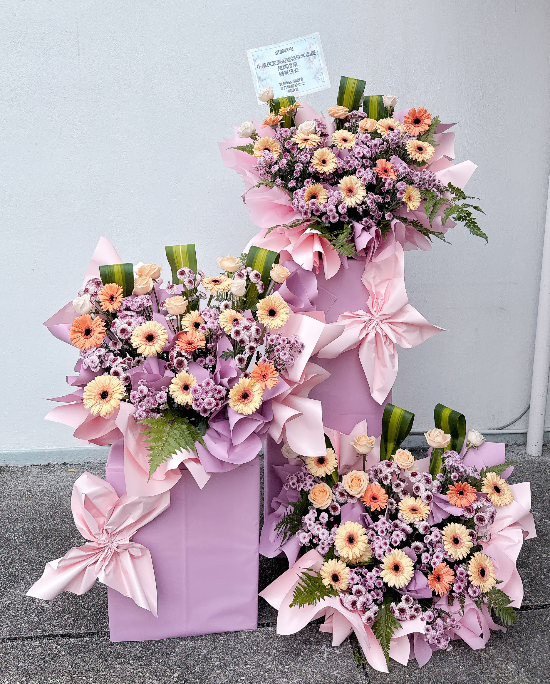 Congratulations Stand 40 – A three‑layer boxed opening stand featuring daisies, pom poms, roses, and paku leaves for a bright, structured celebratory display.