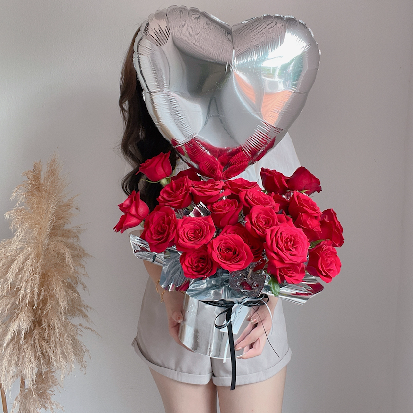 Flower Box – Love Shape Balloon 02. A beautiful flower box featuring 25 stalks of imported red roses & a heart shape foil balloon.