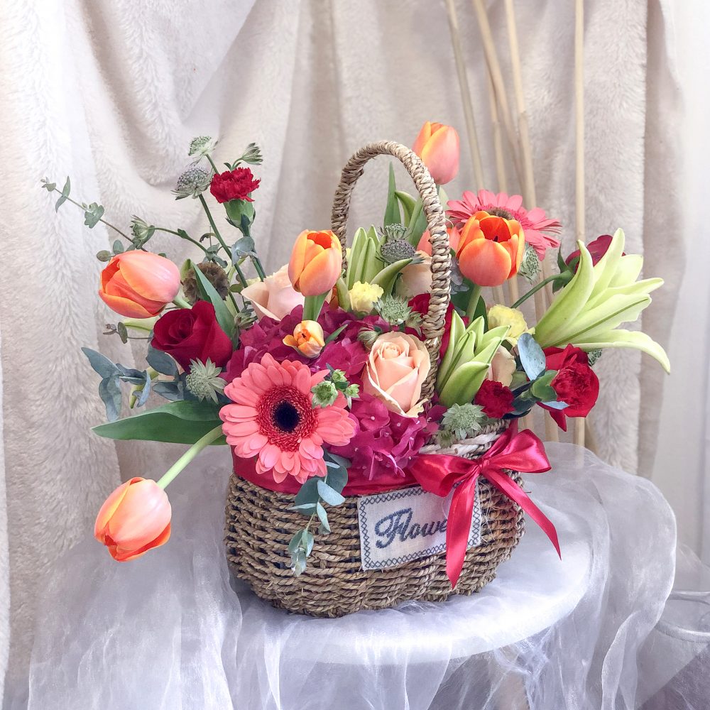 Lilies, Daisy, Tulips, Hydrangea, Roses & Eucalyptus Leaves creatively arranged into a flower basket.