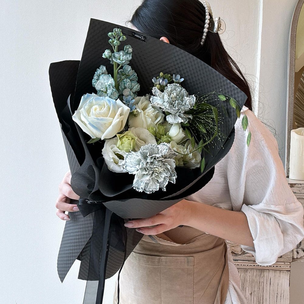 Fresh Flower Bouquet 42 – A fresh flower bouquet wrapped in a dark, elegant finish, featuring roses, matthiola, carnations, fountain grass, and blue oxypetalum for a modern, moody, and refined look.
