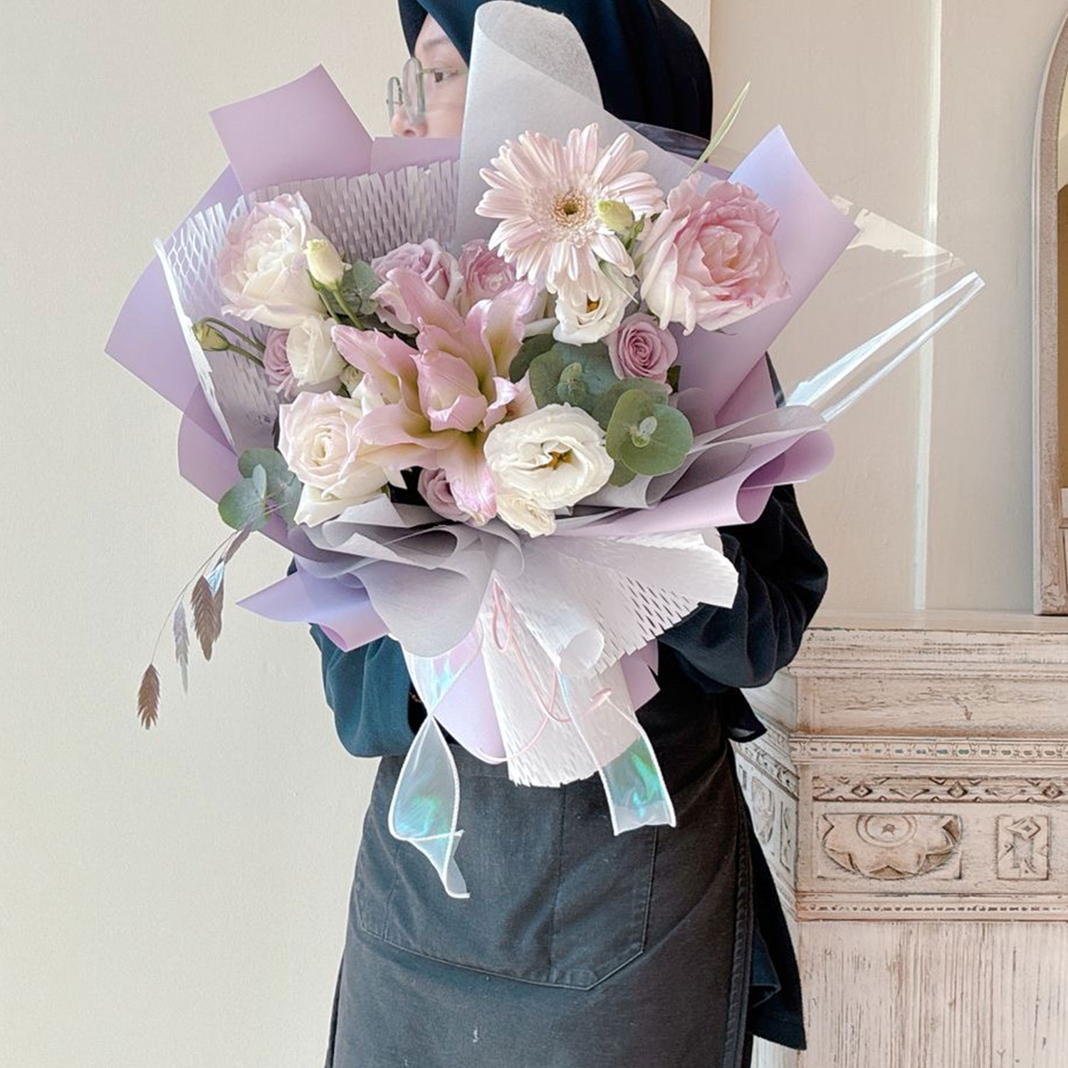 Fresh Flower Bouquet 44 – Hand-tied for serene romance, this lilac-themed bouquet artfully blends roses, eustoma, lilies, daisies, and silvery cineria into a fragrant, textural masterpiece of soft purple hues.