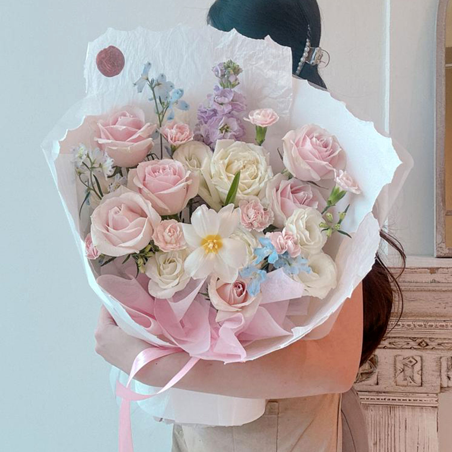 Fresh Flower Bouquet 45 – This lush pink-themed bouquet harmoniously blends roses, tulips, and eustoma with delicate mini delphinium, fragrant matthiola, and spray carnations for a perfectly romantic and textured display.