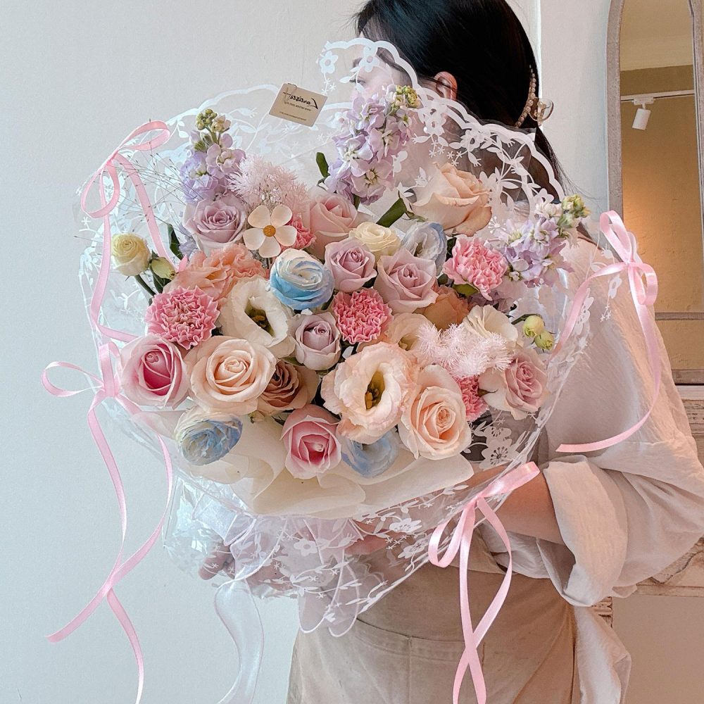 Fresh Flower Bouquet 49 – this sweetly romantic bouquet combines lush carnations, roses, fragrant matthiola, and delicate eustoma, finished with preserved fish leaves for a princess-perfect, texturally enchanting gift.