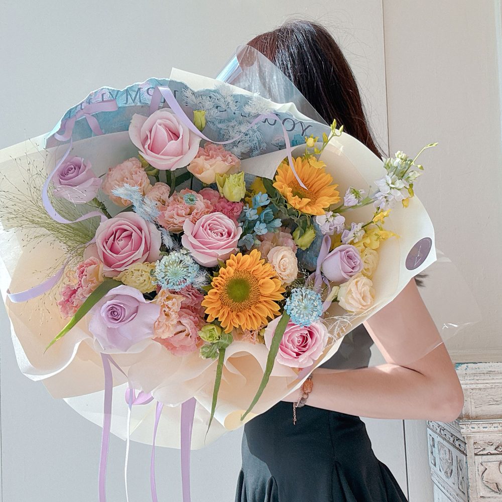Fresh Flower Bouquet 57 – A uniquely joyful and textural masterpiece, this special mixed bouquet bursts with sunny sunflowers, rare blue oxypetalum, delicate eustoma, airy lace flower, playful dancing lady orchids, flowing fountain grass, and lasting preserved fish leaves.
