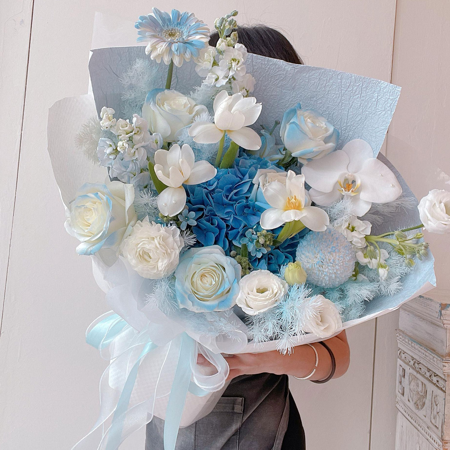Fresh Flower Bouquet 58 – A cloud-like dream of soft serenity, this baby blue bouquet beautifully blends hydrangea, tulips, roses, eustoma, daisies, and fragrant matthiola, finished with elegant preserved fish leaves for a touch of lasting texture.