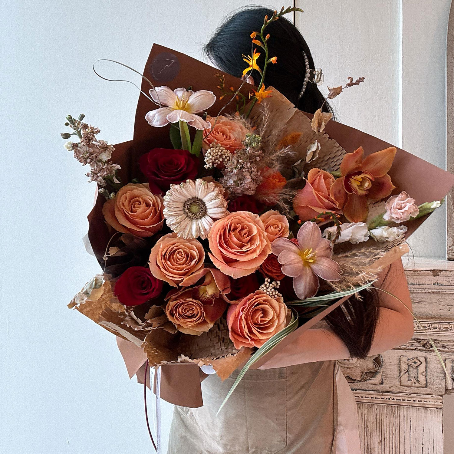 Fresh Flower Bouquet 62 – A bold and elegant statement, this fresh bouquet of orchids, roses, daisies, tulips, and fragrant matthiola is strikingly presented in sophisticated brown color wrapping.