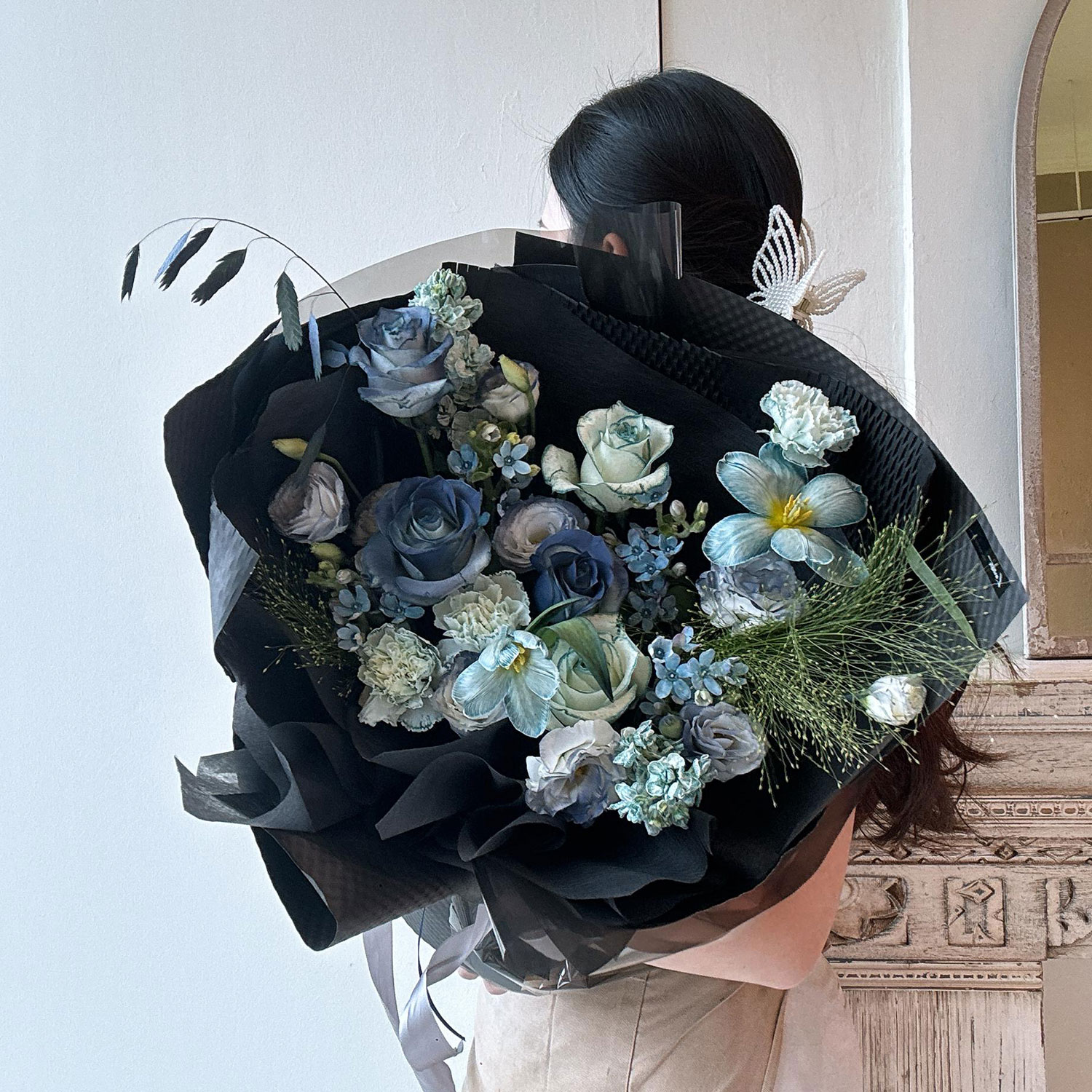 Fresh Flower Bouquet 63 – this dark-themed bouquet blends deep roses, carnations, and tulips with striking blue oxypetalum, fragrant matthiola, delicate eustoma, and airy fountain grass for a captivating contrast.