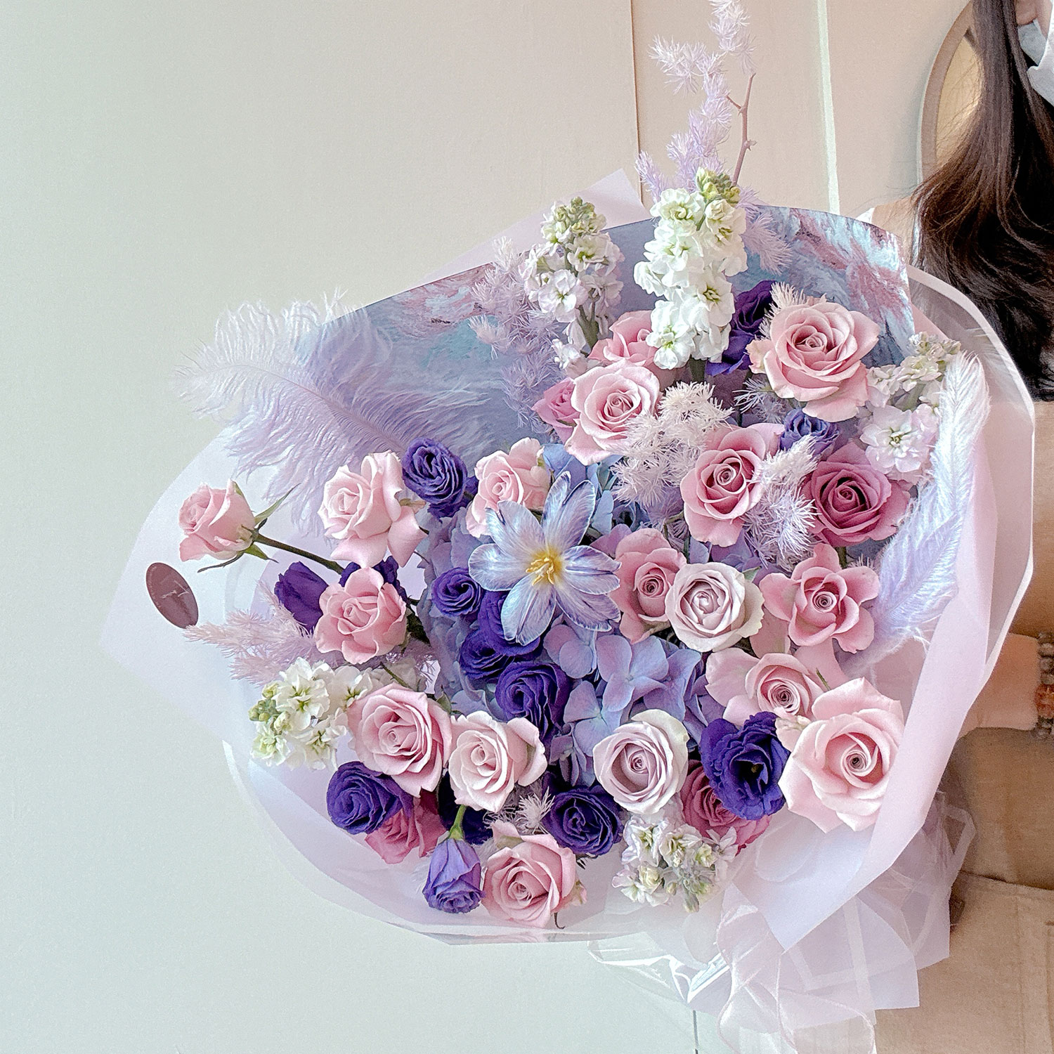 Fresh Flower Bouquet 70 -A dreamy pink-purple fantasy, blending manta, lilac, and purple roses with dark eustoma, hydrangea, matthiola, preserved leaves, and feathers.