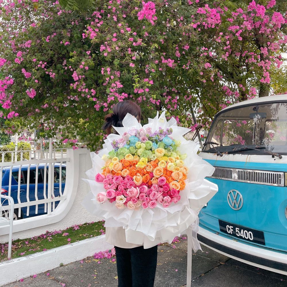 Fresh Flower Bouquet 75 (XL) – A vibrant and joyful arrangement bursting in a perfect rainbow color sequence, artfully composed with matthiola, roses, delicate rose sprays, and ruffled eustoma.