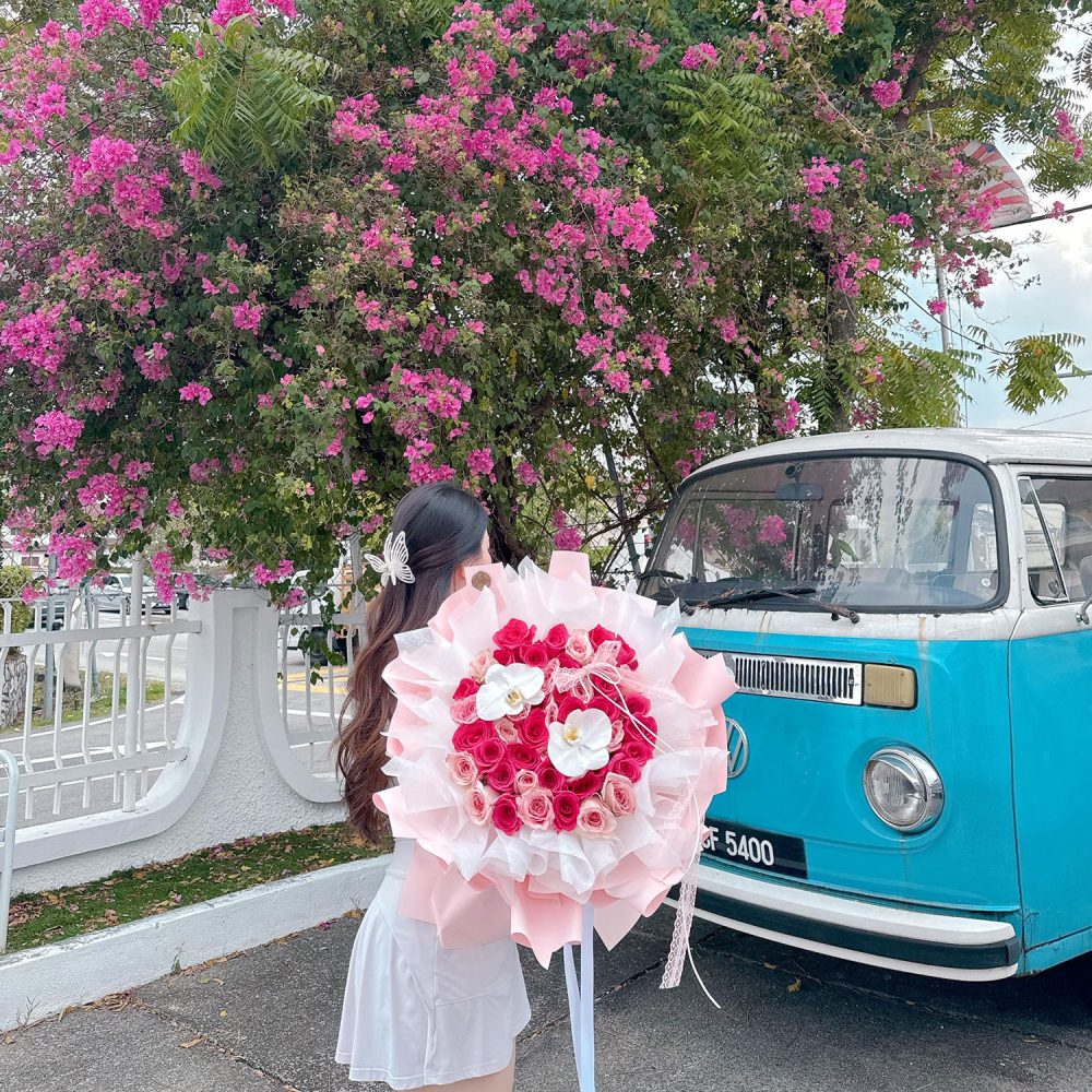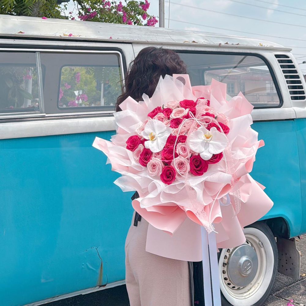 Fresh Flower Bouquet 77 – A lavish and luxurious pink fantasy, featuring 50 premium imported stalks of Lychee Rose and Dark Cherry Pink Rose, elegantly accented with a Phalaenopsis orchid.