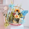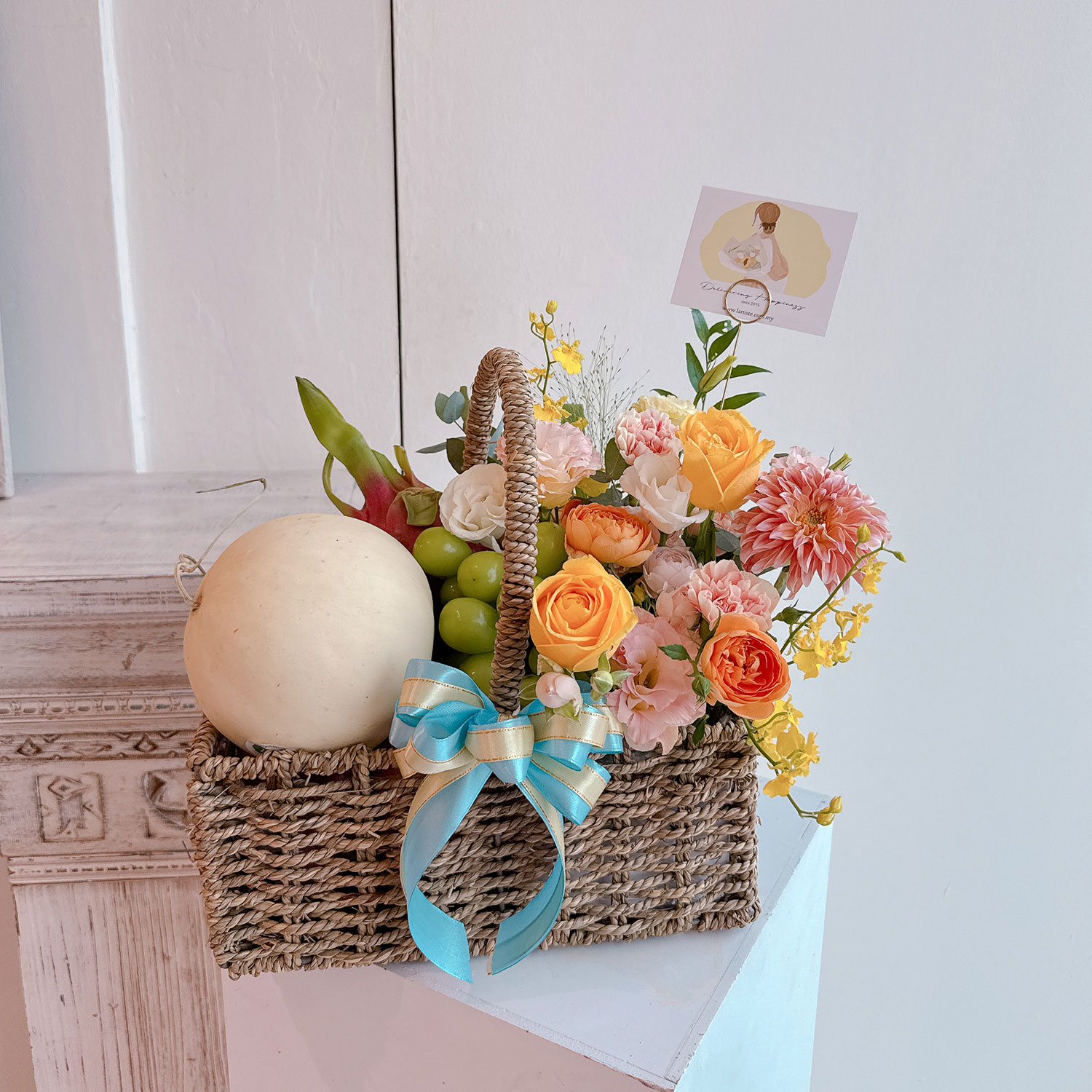 Get Well Soon Basket 08 – A vibrant gift of abundance, this fruit basket is filled with fresh melon, dragon fruit, pear, grapes, apple, and orange, beautifully paired with a floral mix of roses, rose spray, eustoma, dancing lady orchids, and dahlias.