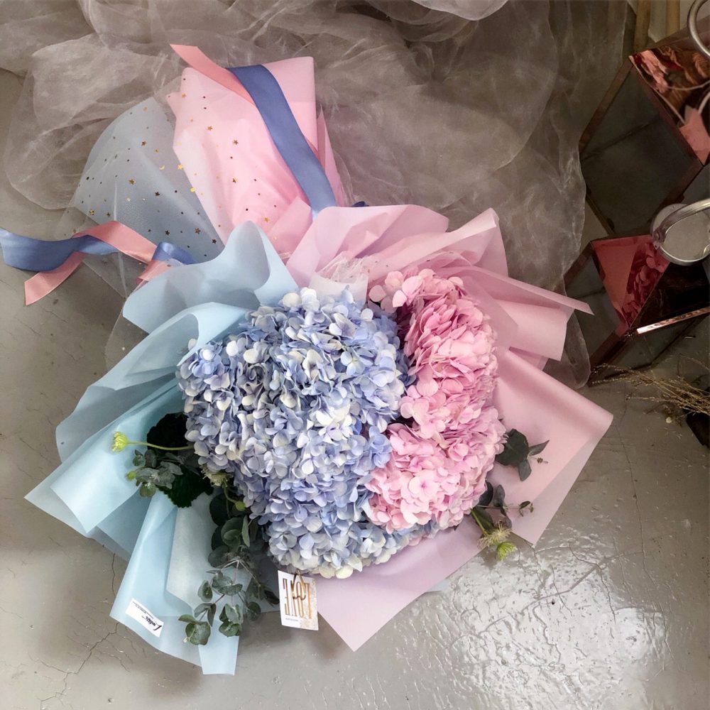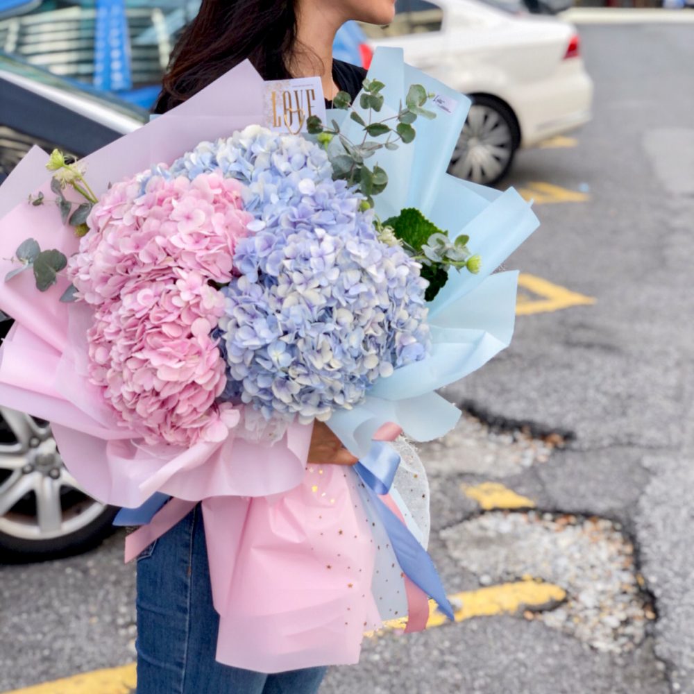 A beautiful hand bouquet with Pink & Light Blue Hydrangea. Please remark your Gift Card Message at Checkout Page.