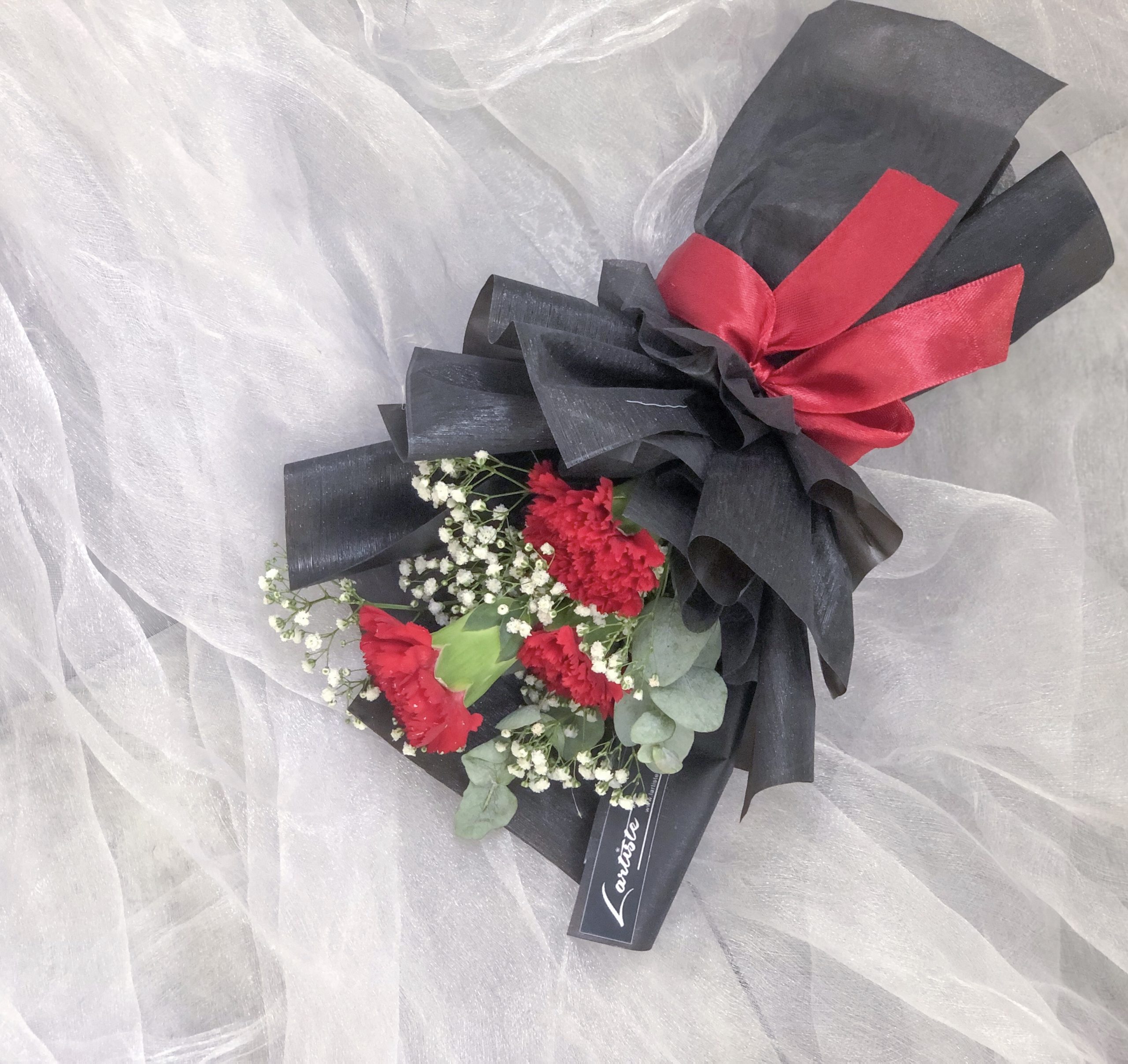 Mini hand bouquet with 3 stalks Carnation (Color of your choice) & Baby’s Breath. **Red, Pink, Dark Pink, Salmon Pink, Purple, Yellow
