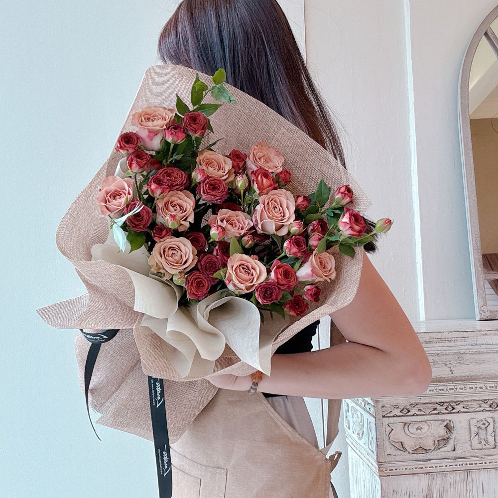 Roses Bouquet 01 – Indulge in rich romance with this unique mixed roses bouquet, blending deep chocolate-bubble rose sprays and warm, velvety cappuccino roses for a decadent and textural statement.