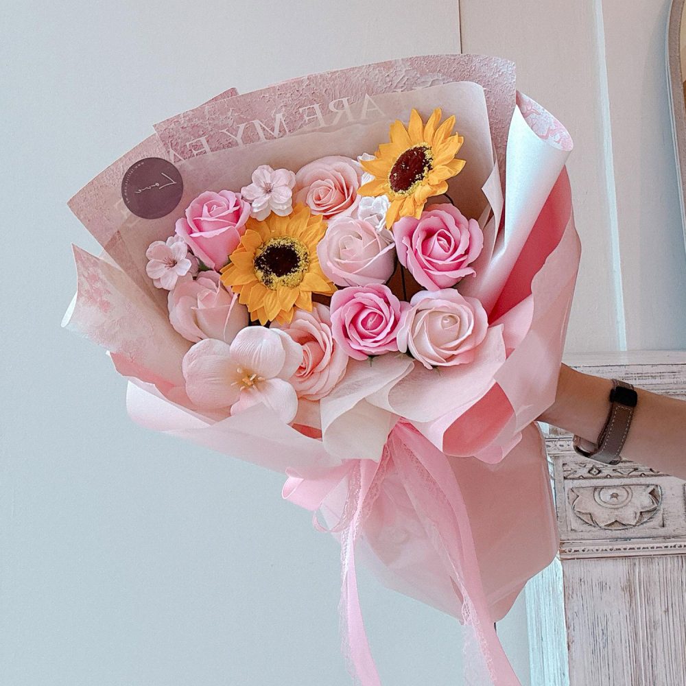 Soap Flower Bouquet 03 – A lasting burst of cheerful beauty, this Soap Flower Bouquet artfully features realistic, fragrant sunflowers and roses for a perfect, everlasting gift.
