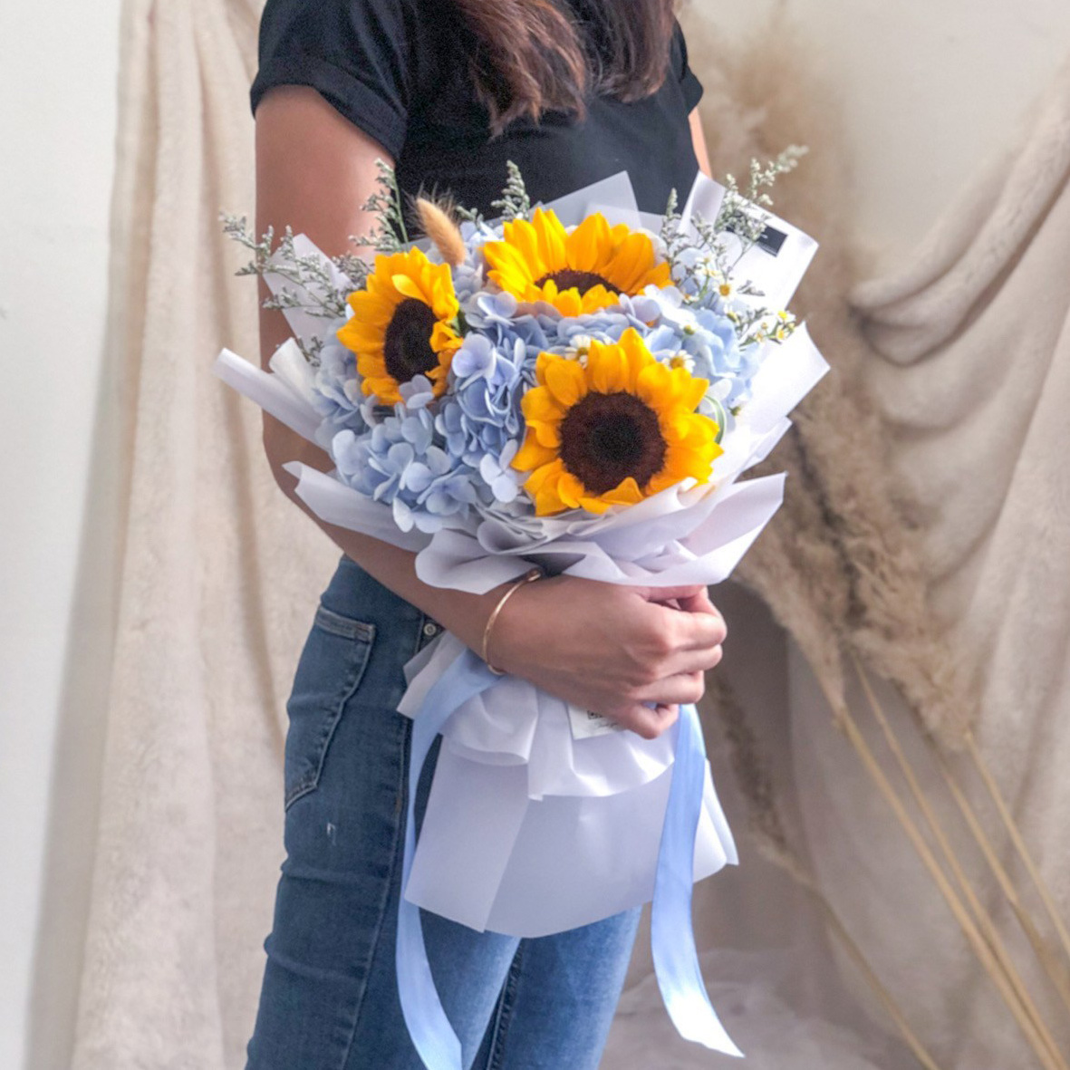 A hand bouquet with Hydrangea, Sunflowers, Bunny Tails, Chamomiles & Caspia. Please remark your Gift Card Message at Checkout Page.