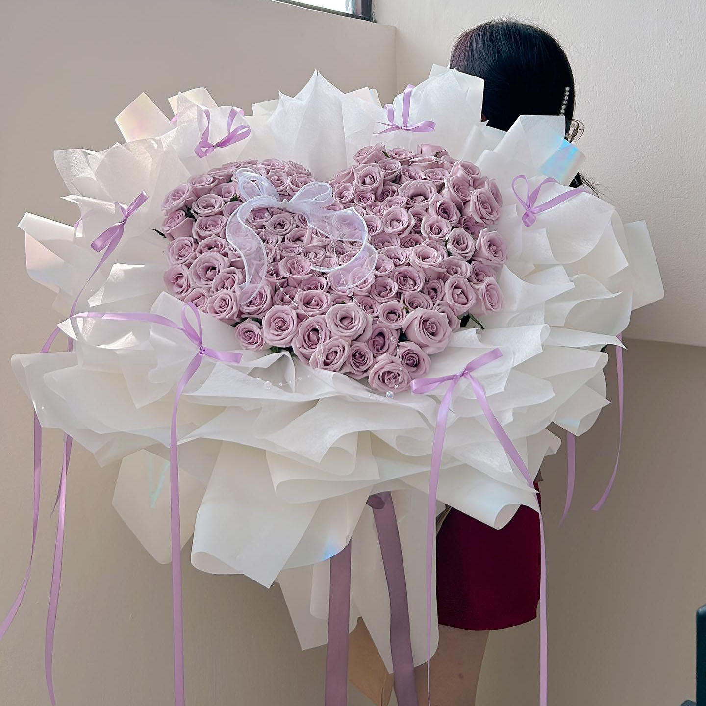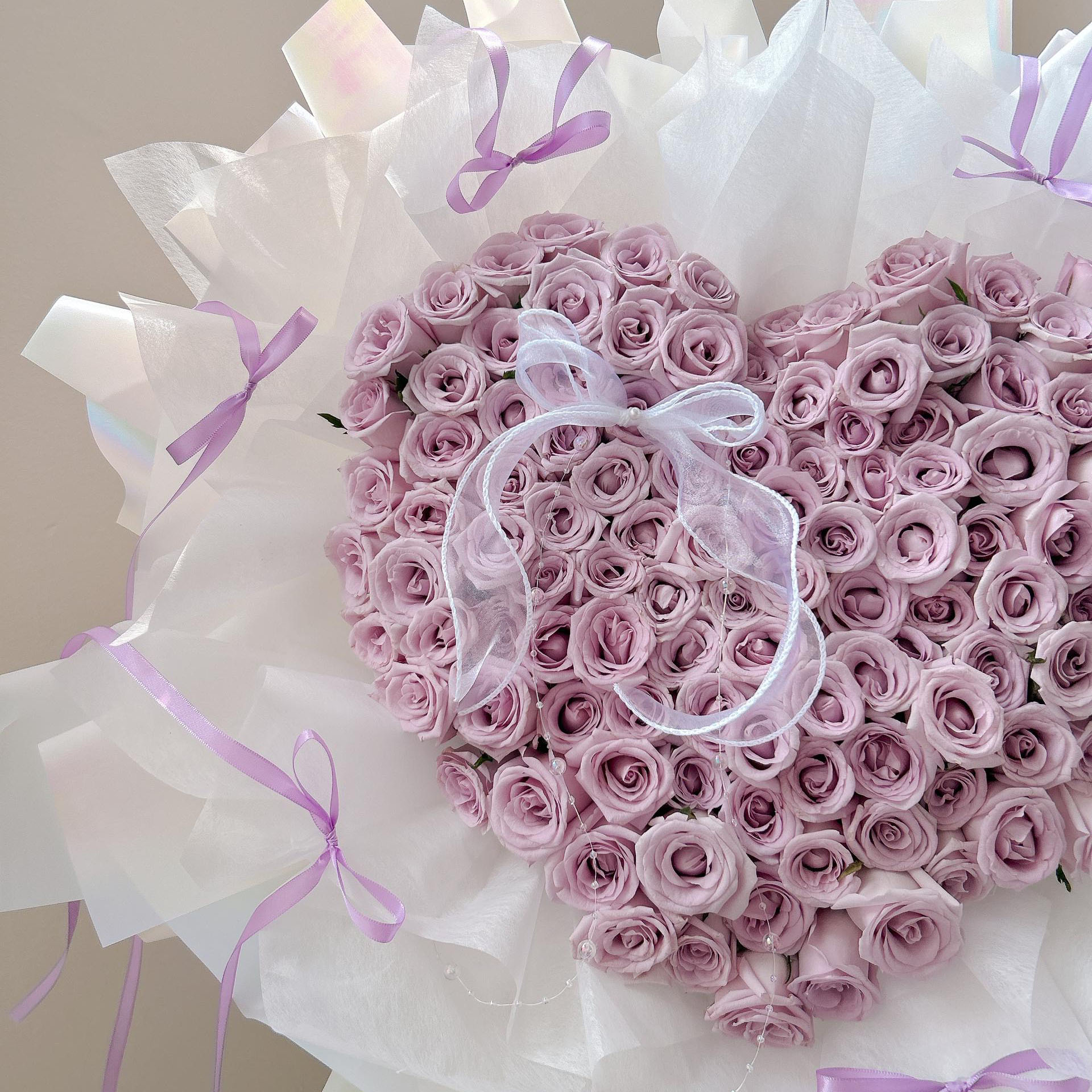 Introducing Sweet Affection: a luxurious heart-shaped bouquet featuring 99 exquisite lilac roses, perfectly crafted to express your deepest love and admiration!