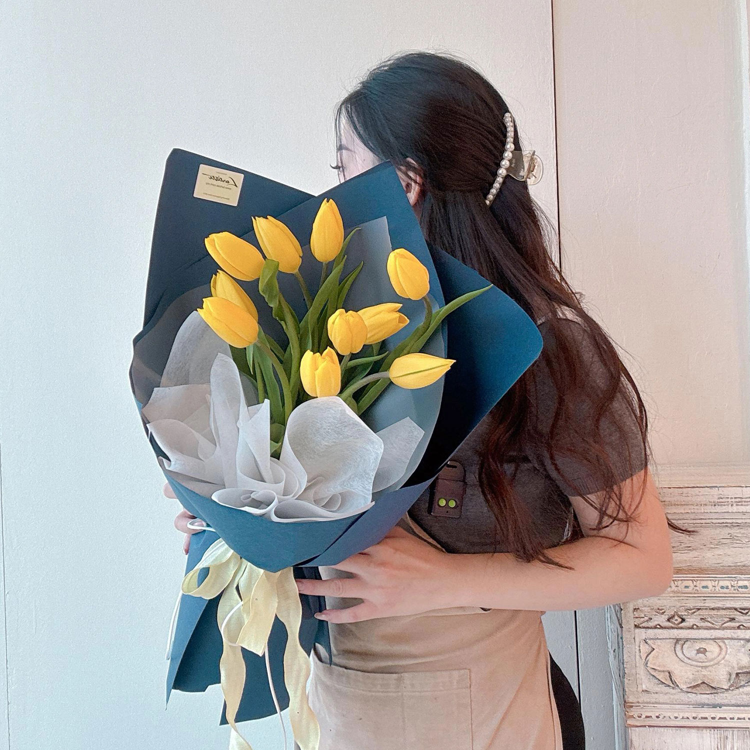 Tulips Bouquet 02 – A cheerful burst of sunshine, this vibrant yellow tulips bouquet is beautifully contrasted by sleek navy wrapping for a modern, elegant gift.